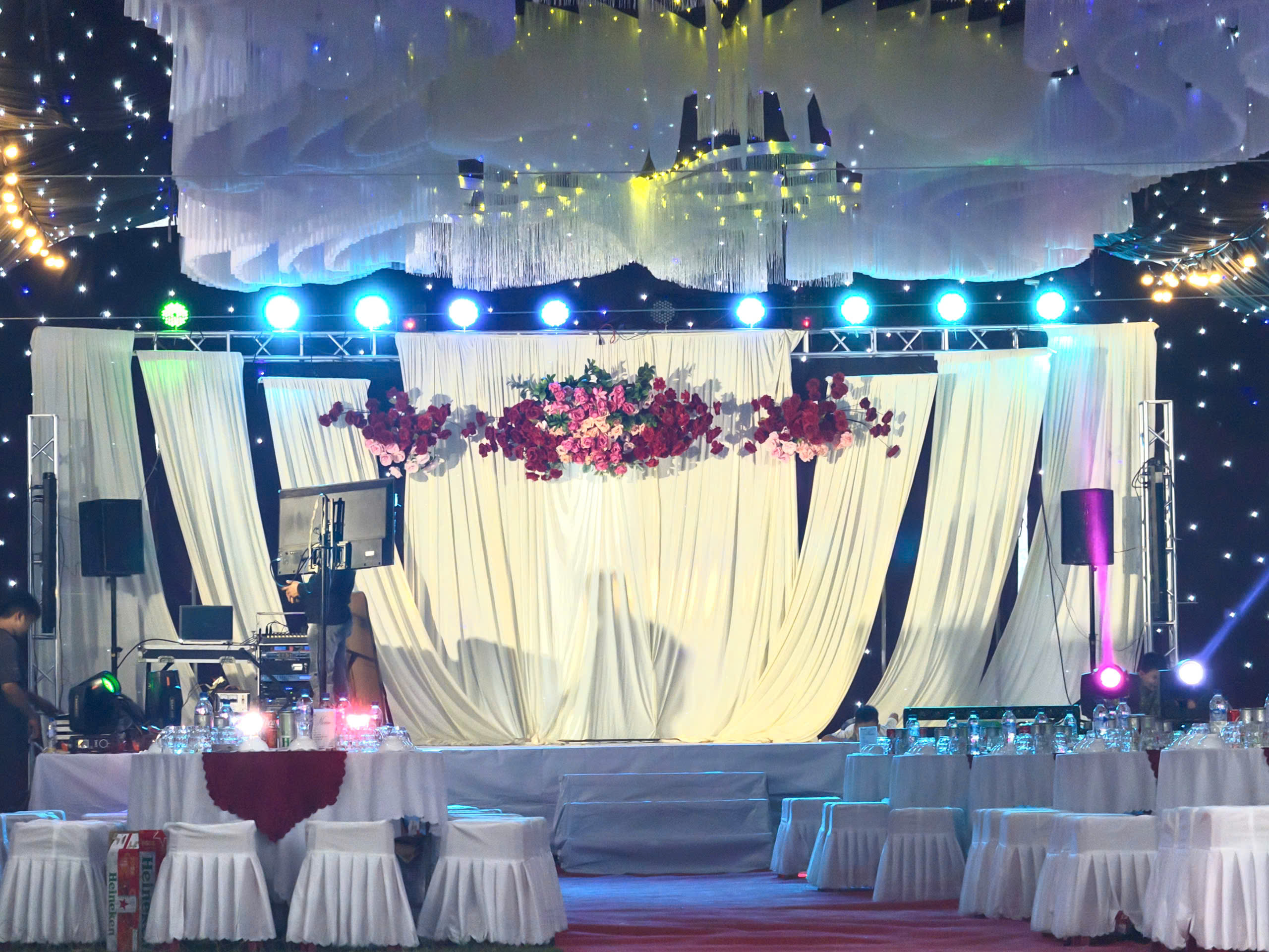 Sân khấu ngày cưới là khu vực trung tâm trong lễ cưới, nơi diễn ra các nghi thức chính như giới thiệu cô dâu – chú rể, phát biểu, cắt bánh, rót rượu và giao lưu cùng khách mời.